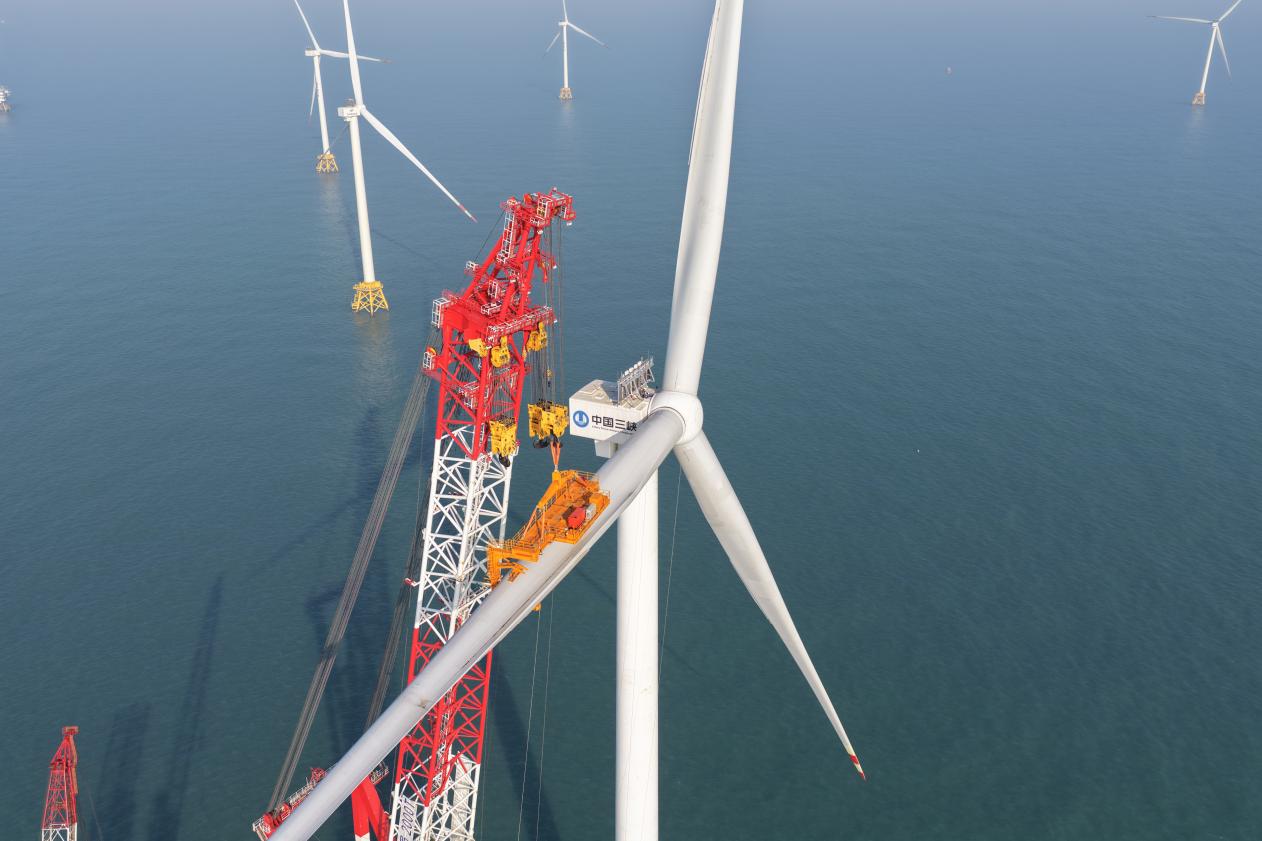 在大型起重装备的操控下,风机第三支叶片与机舱轮毂精确对接并完成螺栓紧固,记号着内行首台20兆瓦海优势电机组吊装功课顺利完成。三峡集团福建分公司供图