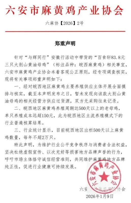 近日,“与辉同业”直播间售卖的“百食轩83.8元三只大别山黄油母鸡”(标注品种:皖西麻黄鸡),激勉行业质疑。安徽省六安市麻黄鸡产业协会发布《肃穆声明》,以为该家具可能存在瑕玷宣传、以次充好等问题,激勉热议。