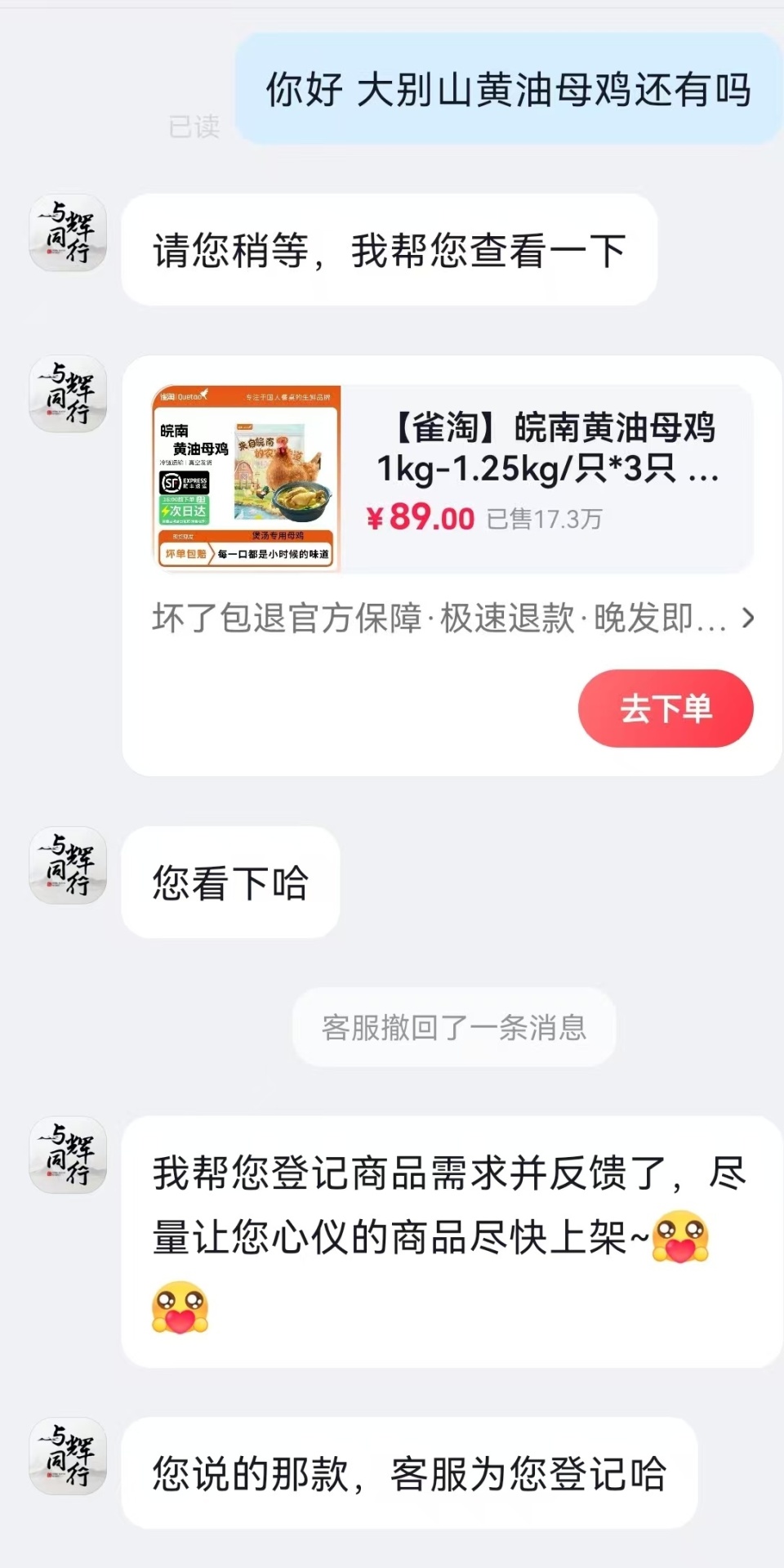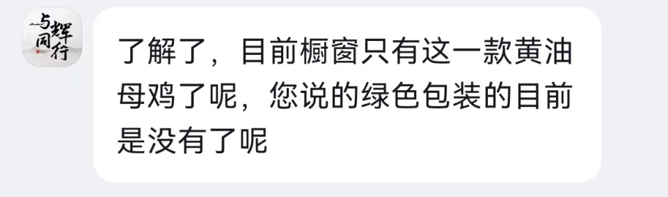 九派新闻在电商平台“与辉同业”账号橱窗中搜索“大别山黄油母鸡”,未检索到该商品。又名客服称该家具当今无货,并发来另一款标注为“皖南黄油母鸡”的家具,售价为89元3只(1kg-1.25kg/只)。记者以消耗者身份屡次追问涉事商品是否为皖西麻黄鸡,其未正面回话,仅暗示“具体的商品不错参考细目页面的先容”。