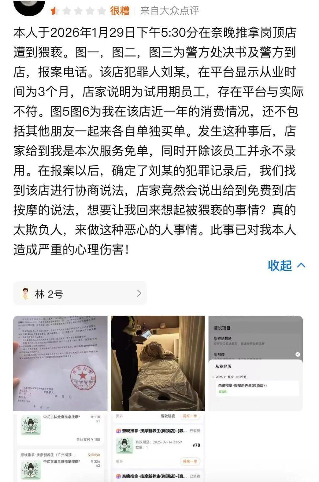 日前,一位奢华者通过好意思团平台的商家评述通说念投诉,她在推拿连锁品牌“奈晚推拿”广州岗顶店遇到猥亵,事发后店家给以她免费到店推拿的抵偿。她暗意,这给她酿成严重的脸色伤害,“思要我讲究思起被猥亵的事情?真实太欺侮东说念主”。